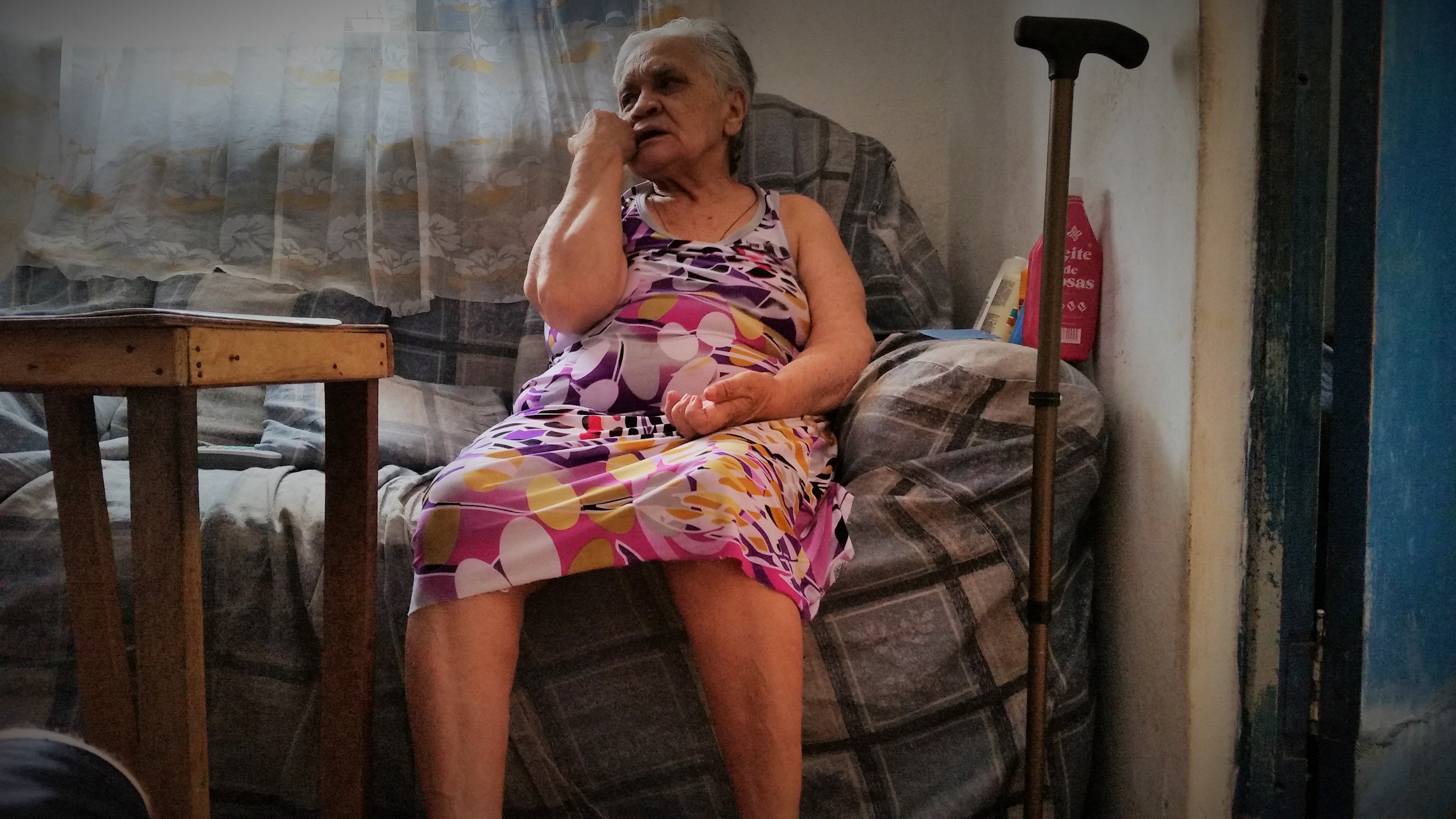 Thanks to God I was very well received in Rio de Janeiro, the worst that I’ve had is this condition that I’m in right now. I had a stroke four years ago. That day I left home, worked until noon, and then I went to catch the bus. The bus was stopped, and I sprinted to catch it, and when I got on my blood pressure increased, since I suffer from high blood pressure. The bus had its air conditioning on, and when I entered I received a shock and bam! I fell on the floor. One of the workers called an ambulance and they took me to the hospital. The doctors told me, “this happened because that’s what you wanted, because you didn’t take your medicine.” I did take my medicine, but it didn’t work that day. It’s been four years that I’ve been like this. The doctors think I’m this way because it’s what I want, that my arm is this way because it’s what I want, that I have trouble getting up because it’s what I want. When I dress I ask God for this pain to go away; I ask Jesus to hear my suffering.
